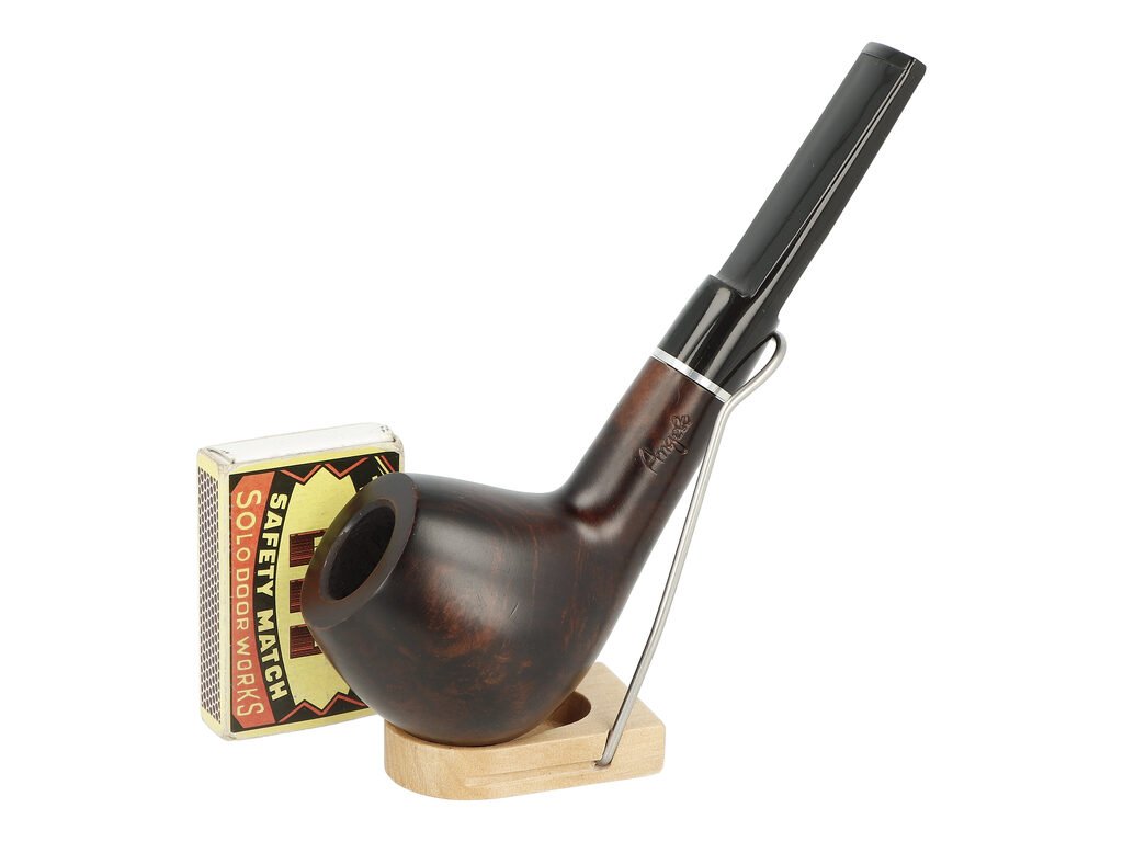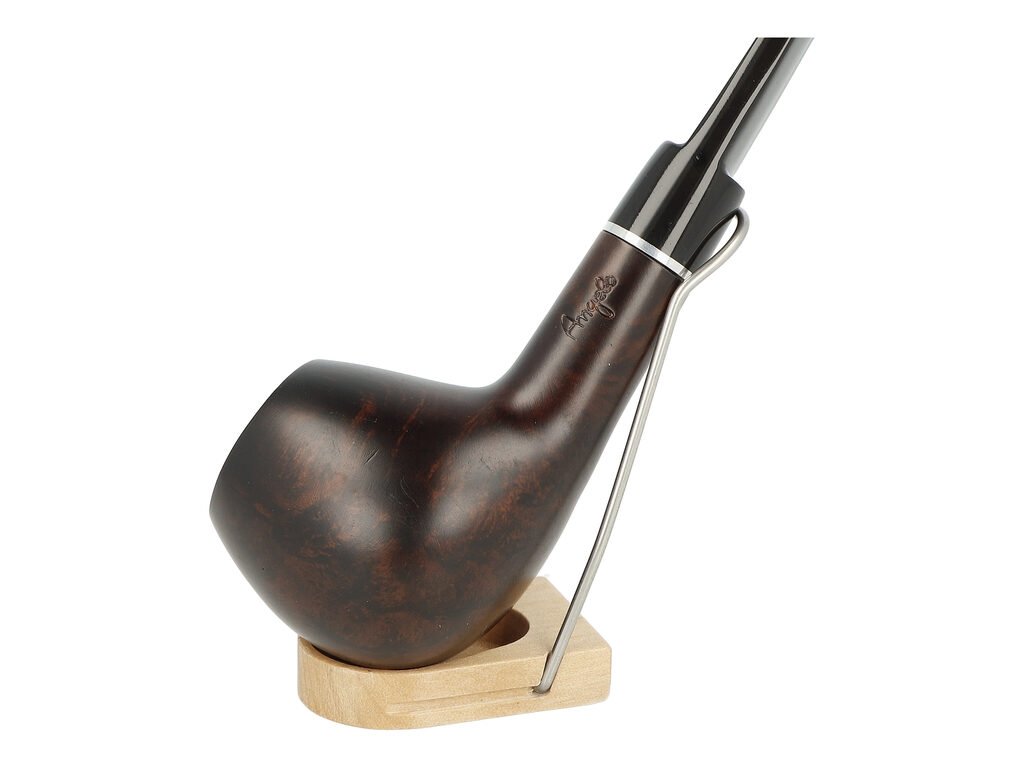 Na boku najdete rytý nápis „Angelo“, který podtrhuje tradiční charakter této modelové řady. Dýmka je určena pro 9mm filtr (dodávána bez filtru) a díky své robustnější hmotnosti dobře sedí v ruce během delšího kouření. Zobrazený stojánek není součástí balení.
