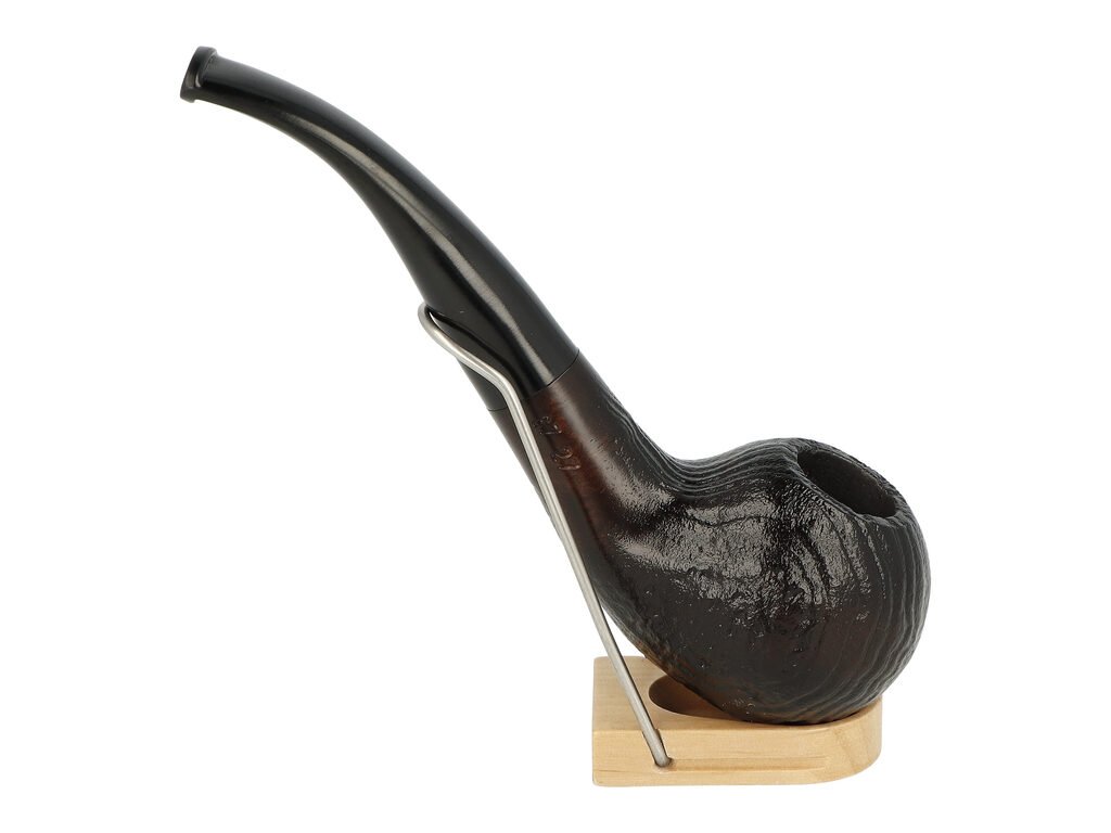 Zahnutá dýmka je ve tmavém hnědém rustikálním provedení. Na boku je zdobená rytým nápisem „BPK“. Hlava dýmky je lesklá, černý ebonitový náustek taktéž.