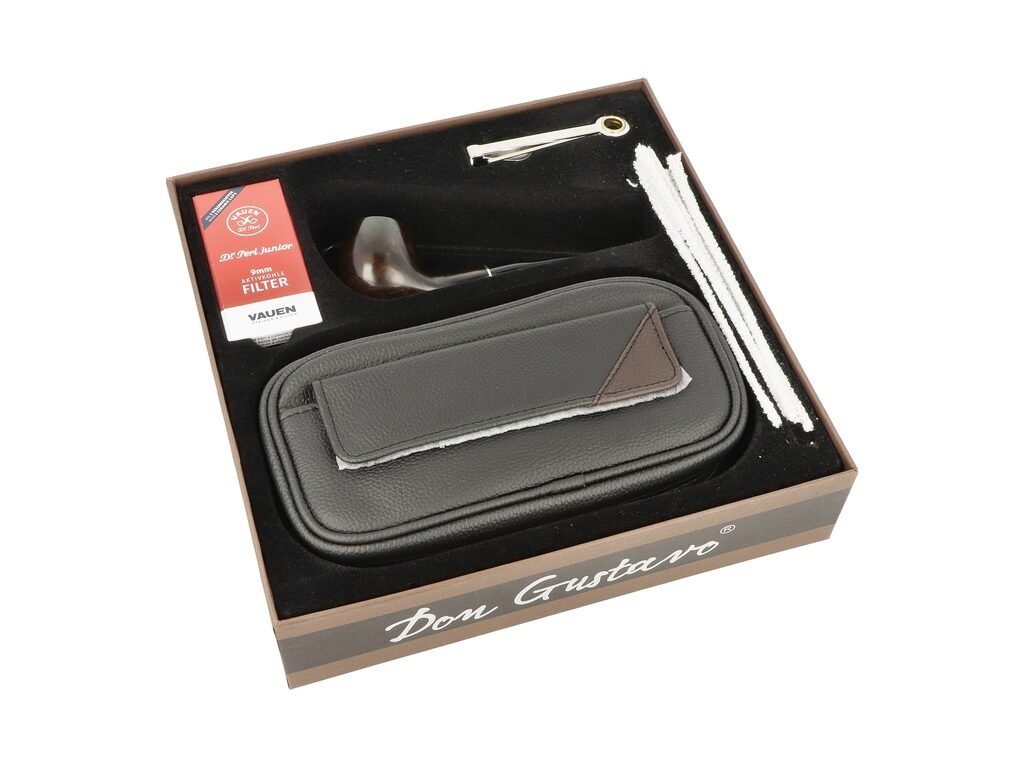 Dárková sada Don Gustavo s dýmkou, pouzdrem na dýmku a příslušenstvím. Dýmková sada obsahuje bruyerovou dýmku Don Gustavo s filtrem 9 mm, koženkové černé pouzdro na dvě dýmky s vnitřními kapsami a zavíráním na zip, kovové dusátko, filtry do dýmky Vauen (balení 10ks) a čističe dýmky (5ks). Dýmková sada Don Gustavo je vhodná jako dárek pro začínajícího kuřáka dýmky, který najde v tomto setu zcela vše, co bude potřebovat. Zobrazený dýmkový stojánek není součást balení.