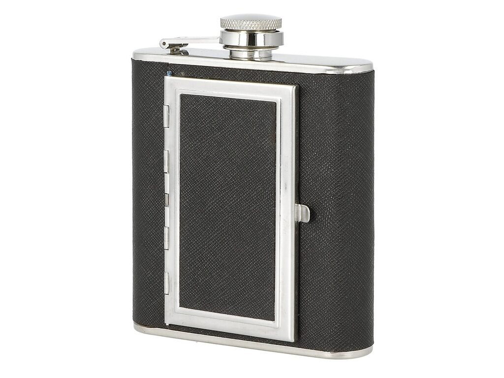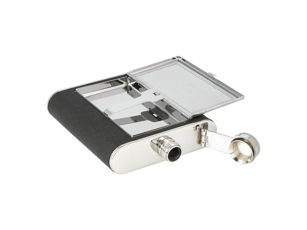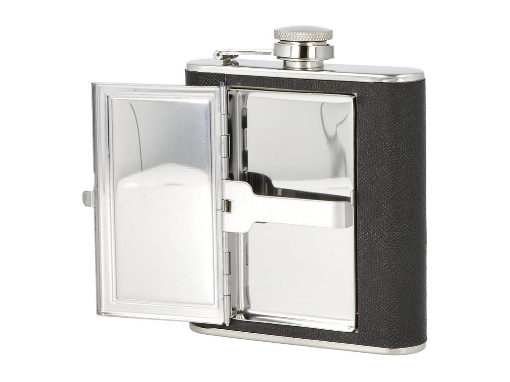 Nerezová placatka na alkohol v koženkovém obalu s pouzdrem na cigarety. Likérka Angelo je vyrobená z nerezové oceli s leštěným povrchem. Tělo placatky je potažené koženkou v černé barvě s jemnou strukturou. Na přední straně placatky najdeme zavírací pouzdro na 6 cigaret klasické velikosti King Size. Uvnitř pouzdra jsou cigarety zajištěné kovovým plíškem s pružinkou. Likérka rovného tvaru je vybavená šroubovacím uzávěrem a držákem víčka, který zabrání jeho ztrátě. Placatku dodáváme v kartonové krabičce.