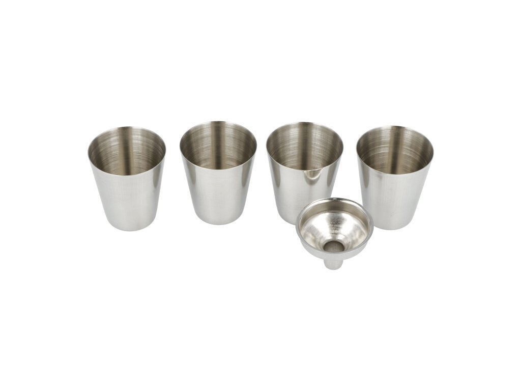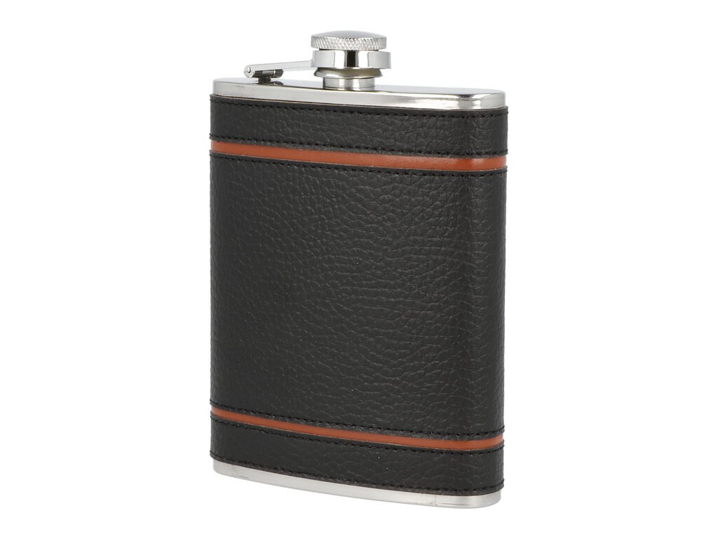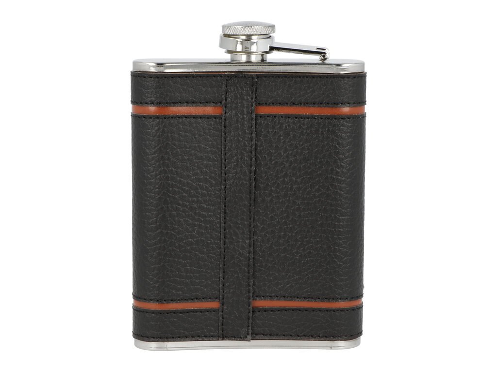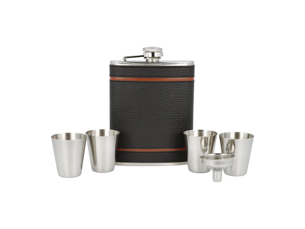 Sada nerezová placatka na alkohol s pohárky a nálevkou. Likérka je vyrobená z kvalitní nerezové oceli s leštěným povrchem. Placatka je potažená černou koženkou v kombinaci s hnědými pruhy. Likérka klasického oblého, prohnutého tvaru je vybavená šroubovacím uzávěrem a držákem víčka, který zabrání jeho ztrátě. Koženkový potah s látkou dodává placatce nevšední vzhled a je příjemný na dotek. Čtyři pohárky a nálevka jsou vyrobené z kvalitního nerezu. Mějte i na cestách při sobě Váš oblíbený nápoj. Skvělý dárek, kterým určitě potěšíte své blízké či kamarády. Placatka s pohárky je dodávaná v dárkové krabičce.