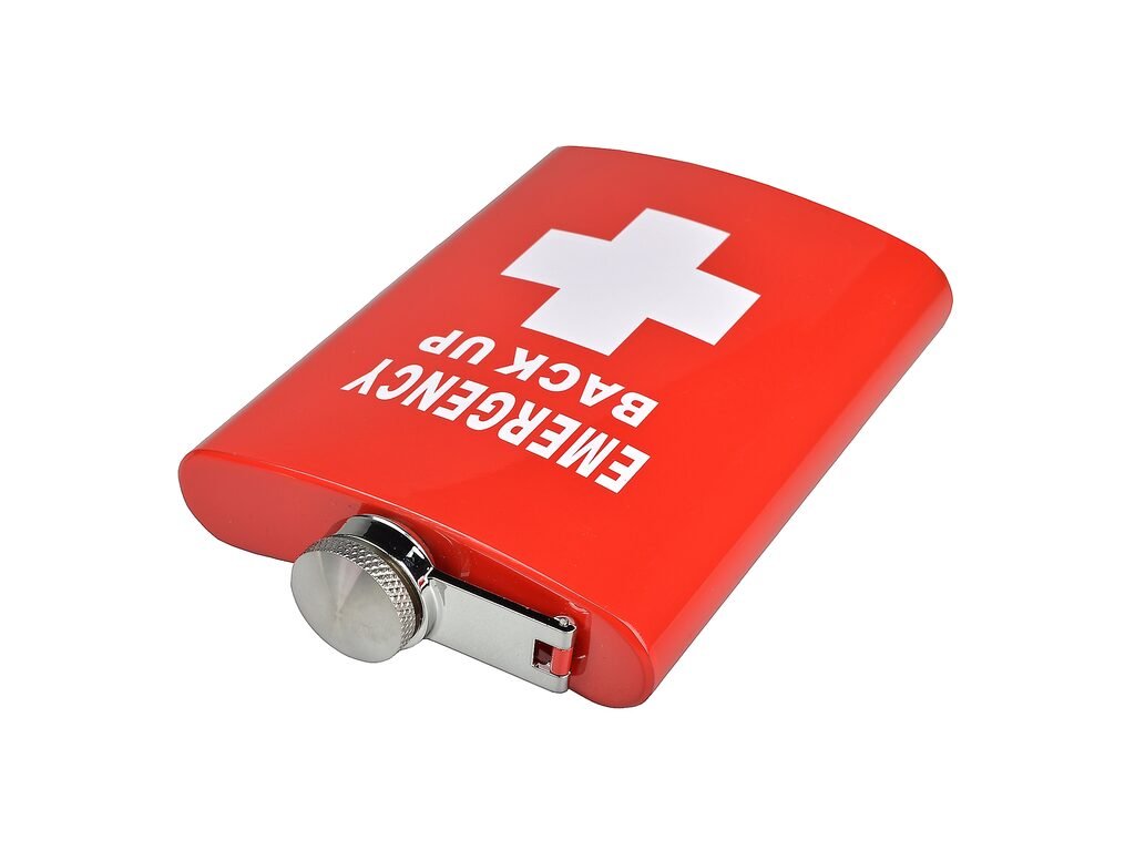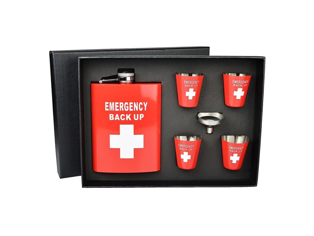 Dárková sada placatka na alkohol (likérka) Emergency Back Up s pohárky. Likérka je vyrobená z kvalitního nerezové plechu a její povrch je v pololesklém červeném provedení s bílým motivem. V této atraktivní placatce budete mít vždy vaše oblíbené pití při sobě. Obsah sady: likérka, 4 pohárky, nálevka.