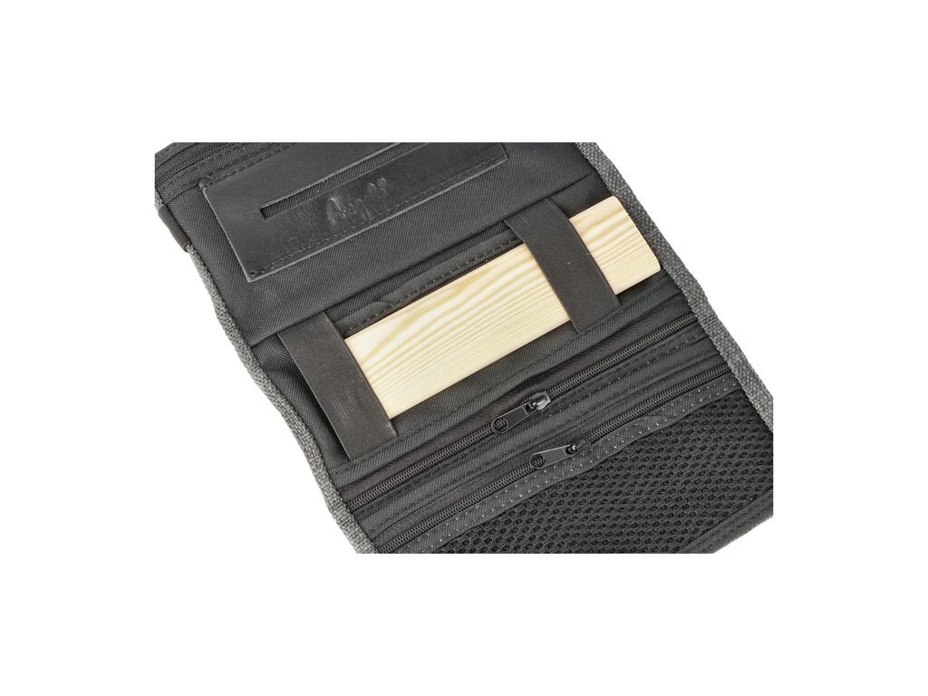 Pouzdro na tabák Angelo RYO s balicí podložkou. Látkové pouzdro na tabák a další kuřácké potřeby, které potřebujete při balení cigaret je vyrobené z pevné režné látky v šedém provedení. Po rozevření pouzdra najdeme hlavní kapsu na tabák, tři uzavíratelné kapsy na zip, kapsu na papírky a dřevěnou balicí podložku. Pro uzavření pouzdro přeložíte a přetáhnete gumou.