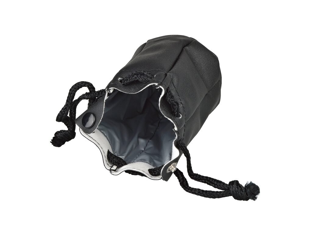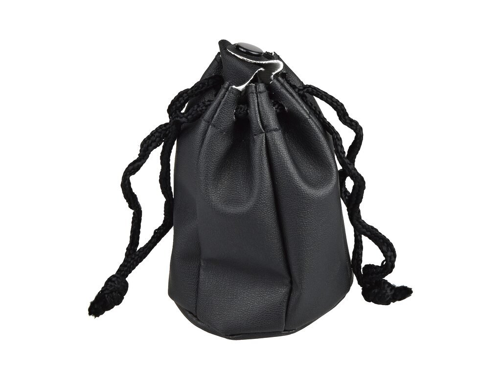 Koženkový pytlík na tabák v černé barvě. Stažení pytlíku zajišťuje šňůrka a patent.