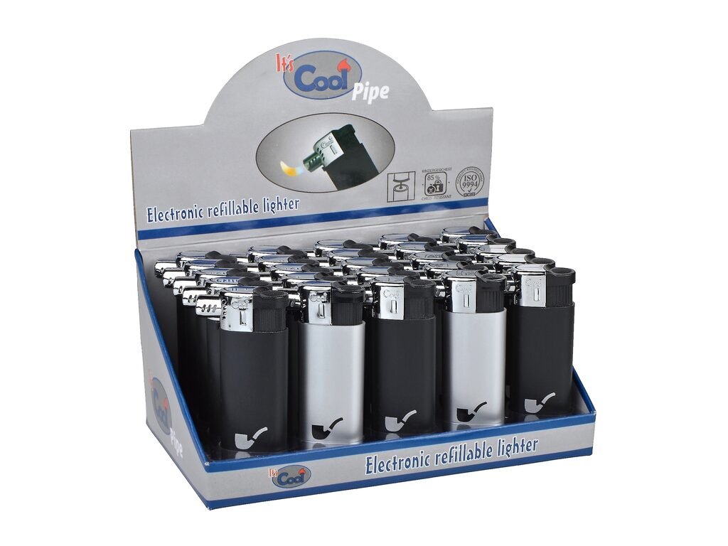 Dýmkový zapalovač. Zapalovač je plnitelný. Výška 7,5cm. Provedení: černé, stříbrné. Prodej pouze po celém balení (displej) 25 ks.